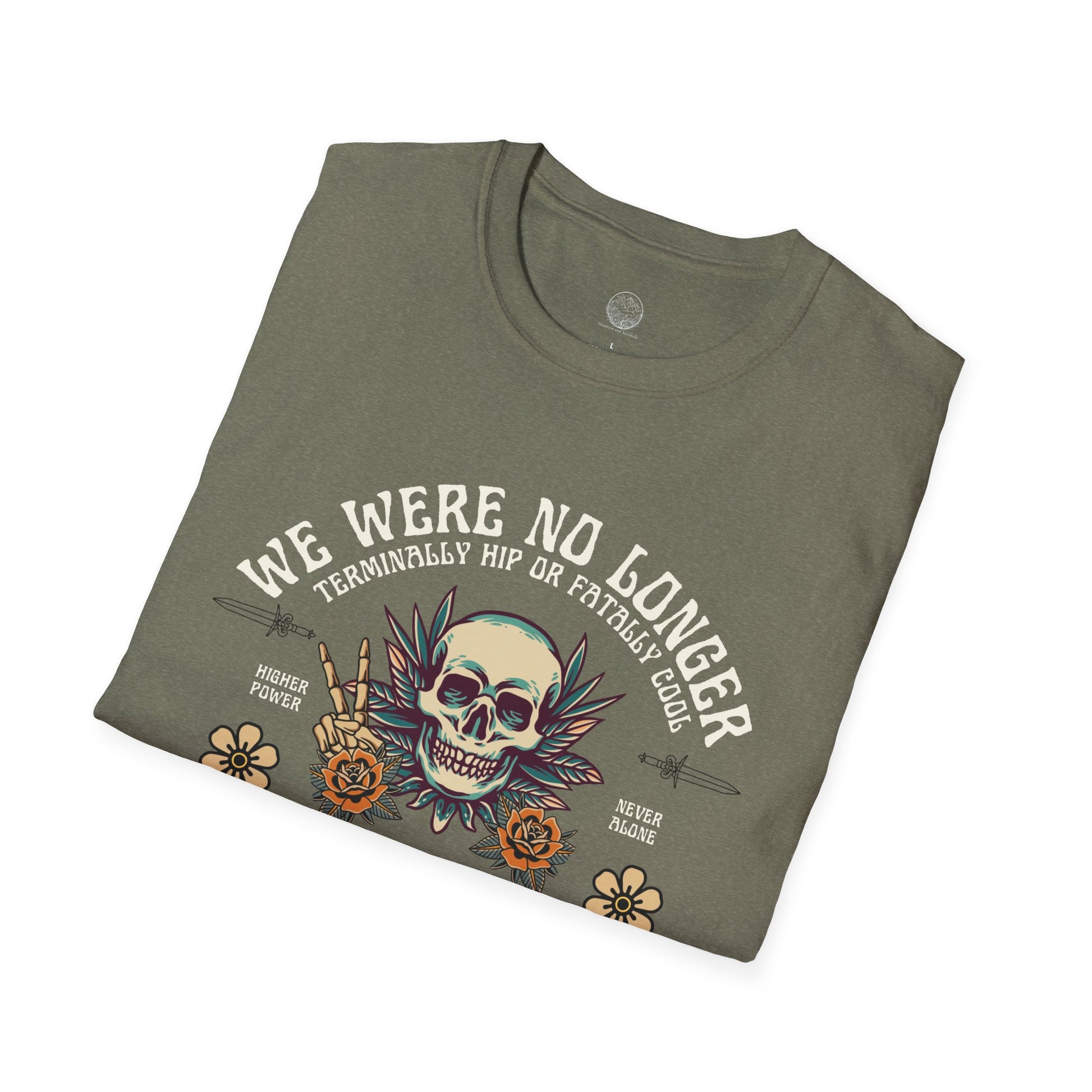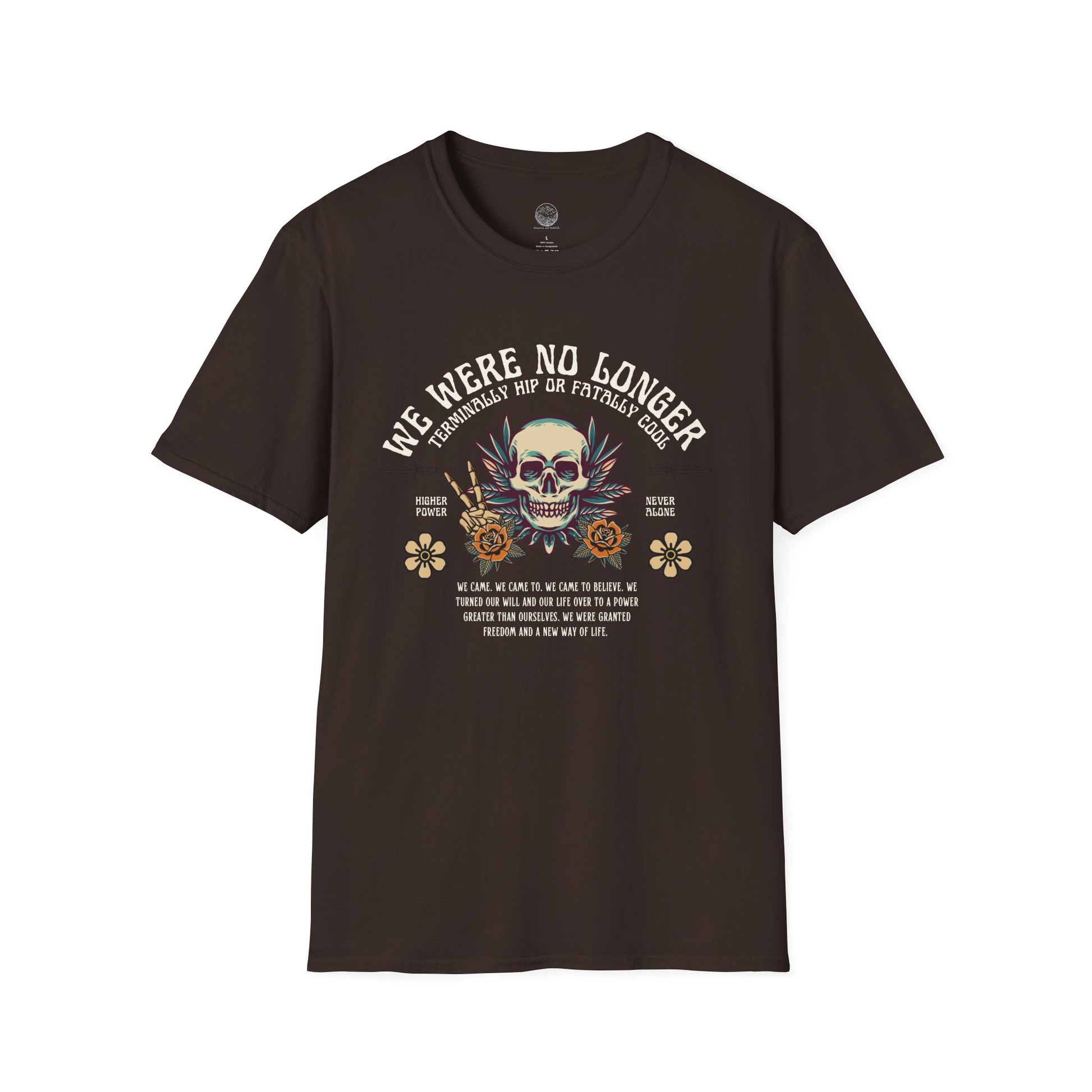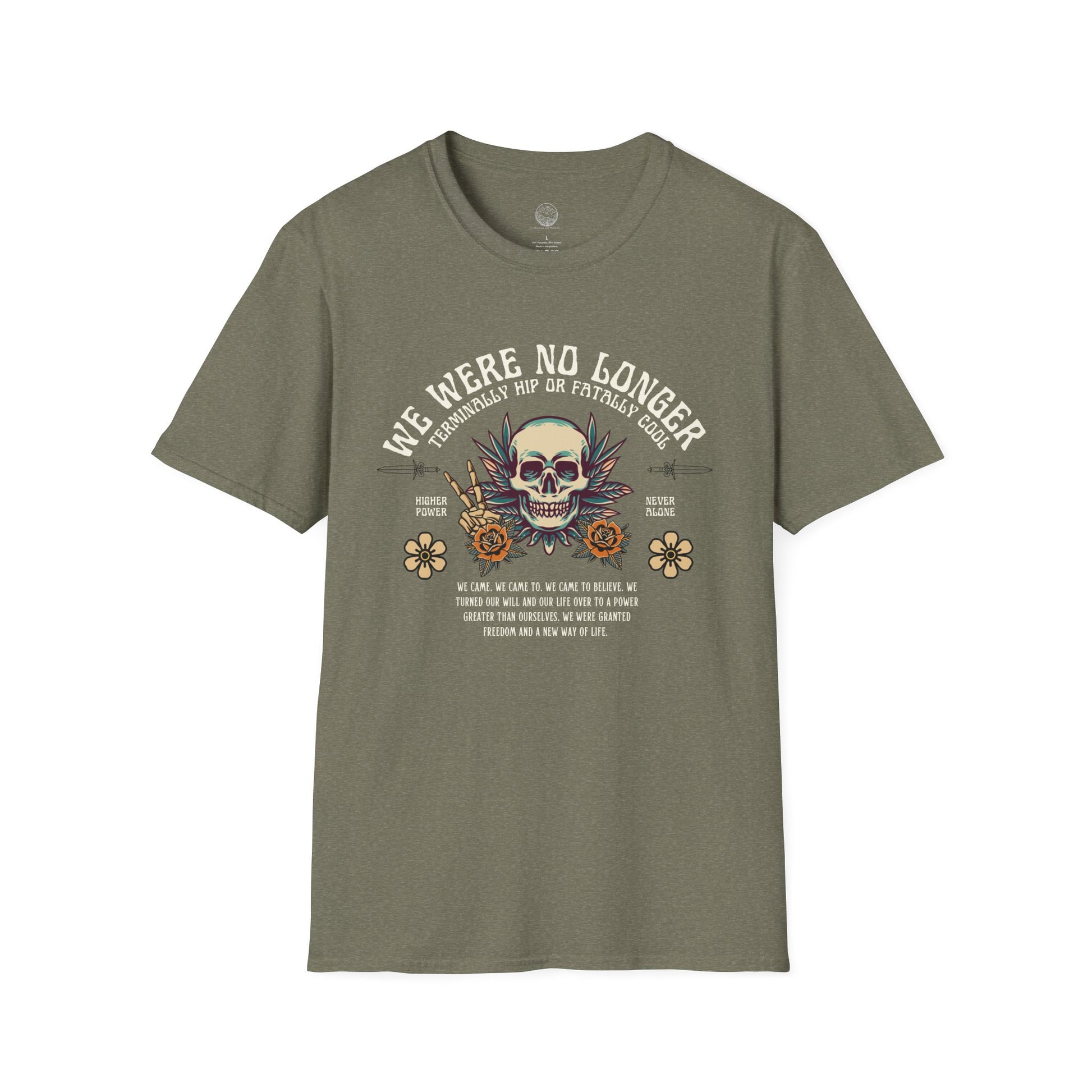 This Tee features the phrases: "We were no longer terminally hip or fatally Cool" and "We Came. We Came To. We came To Believe." Inspired by addiction Recovery, this bold message subtly blends into everyday wear.