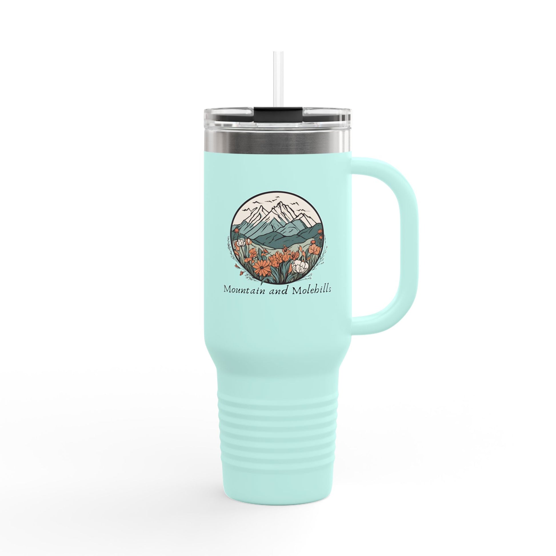 Stay inspired and motivated with this iconic Mountain and Molehills Logo 40 oz Insulated Travel Mug. Perfect for those in addiction recovery, seeking spiritual inspiration, or embracing new beginnings with positive affirmations. Ideal for long trips, outdoor activities, and daily use, this travel mug is a must-have for anyone on a journey to self-improvement.